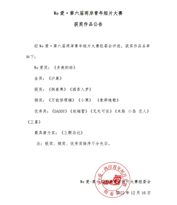 在活動中,主辦方公佈We愛·第六屆兩岸青年短片大賽的獲獎名單。