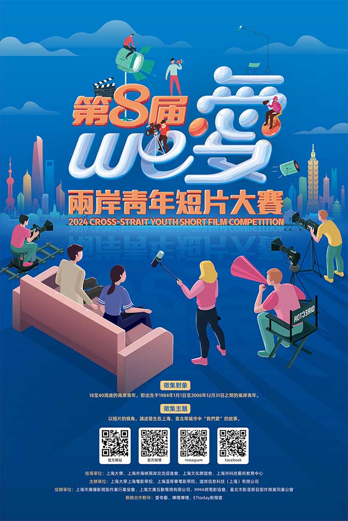 由上海大學上海電影學院、上海市海峽兩岸交流促進會、上海文化聯誼會、上海市科技藝術教育中心指導,上海大學上海電影學院、上海溫哥華電影學院、滬測信息科技(上海)有限公司主辦,上海市廣播影視製作業行業協會、上海文廣互動電視有限公司、MMA微電影協會、臺北市影音節目製作商業同業公會協辦的We愛·第八屆兩岸青年短片大賽,將延續以“我們愛”為主題,時長30分鐘以內,面向兩岸青年徵集短片作品。期許青年的作品有突破創新、有極具導演表達、有充滿生命力、有聚焦中華美食、有現代時尚、有歷史傳承等主題進行創作,特別鼓勵當代青年對社會和時代的觀察與思考,和對未來的美好展望,尤其歡迎兩岸青年合拍作品參賽。