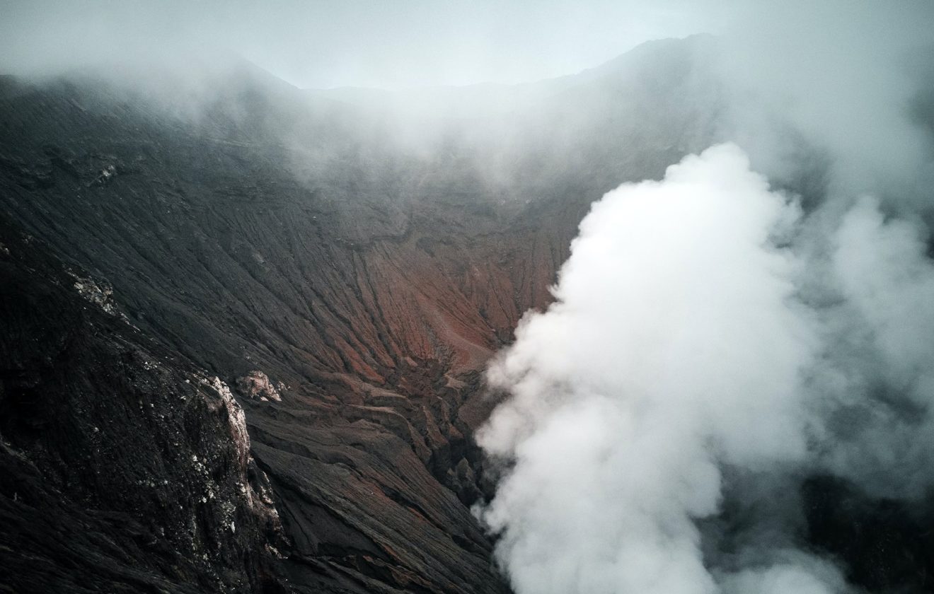 Steaming Volcanic Crater Amid Misty Mountain Surroundings