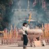 A serene scene of traditional rituals at the temple, where incense offerings fill the air, symbolizing deep devotion and culture.
